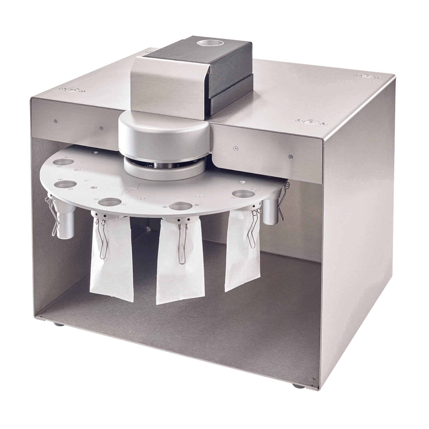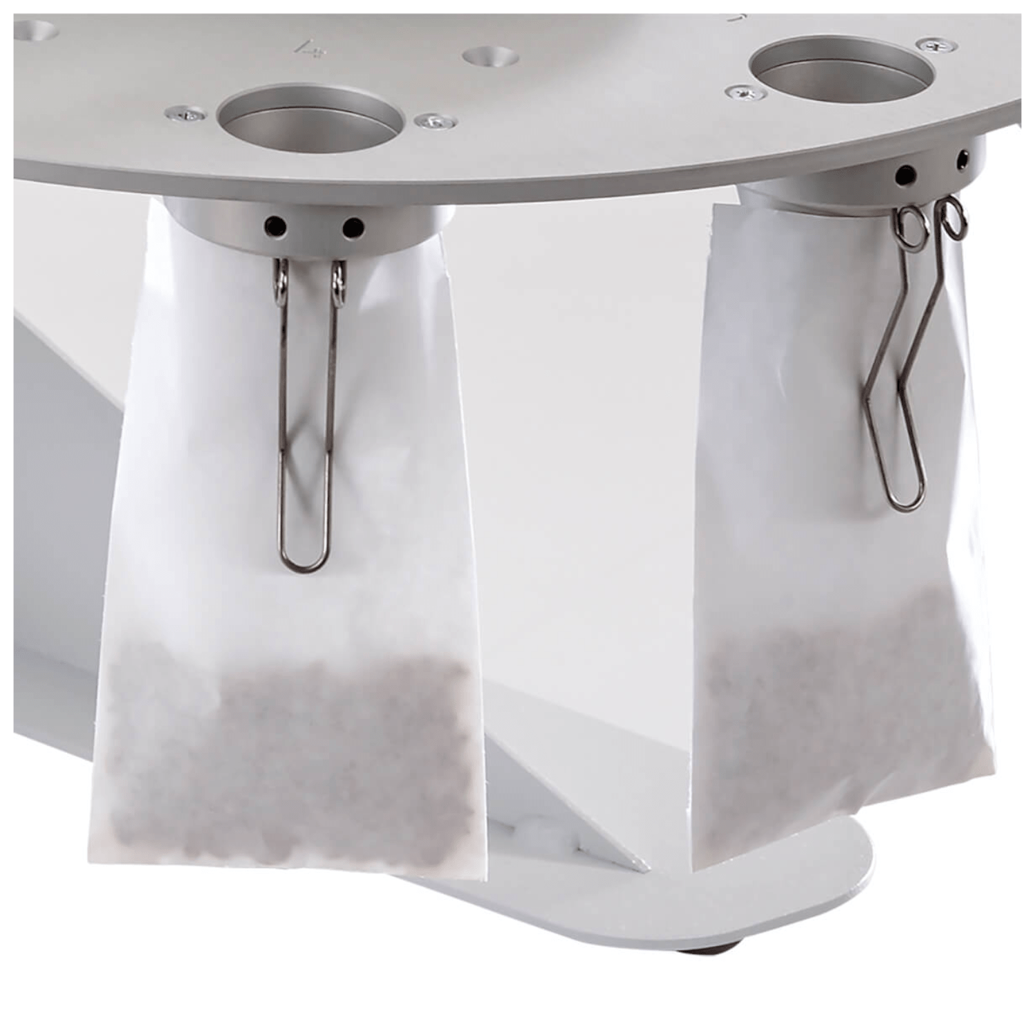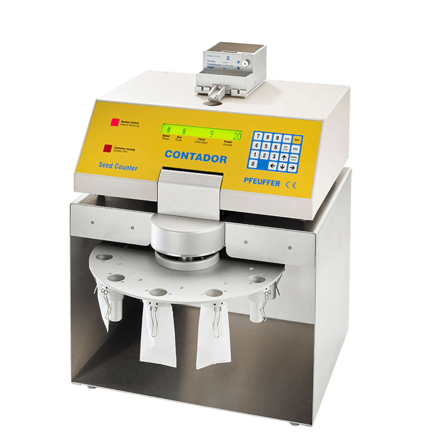- Saat in den Zuführbehälter geben und den Drehteller mit Tüten bestücken. Die gewünschte Körnerzahl pro Tüte am Contador oder über die PC – Software vorwählen und starten. Das Contatdor läuft an und zählt die gewünschte Körnerzahl in die erste Tüte. Der Umlauf der Tüten kann Kontinuierlich oder als einzelner Umlauf erfolgen. So können regelmäßig Tüten getauscht oder nach zählende der komplette Drehteller neu bestückt werden. Ein Standfuß für den Drehteller erleichtert diesen Vorgang . Die Standzeiten während des Füllvorganges werden so auf ein Minimum reduziert. Durch einen Sensor erkennt das Contador automatisch die Tüten, so das kein kostbares Saatgut daneben fällt.