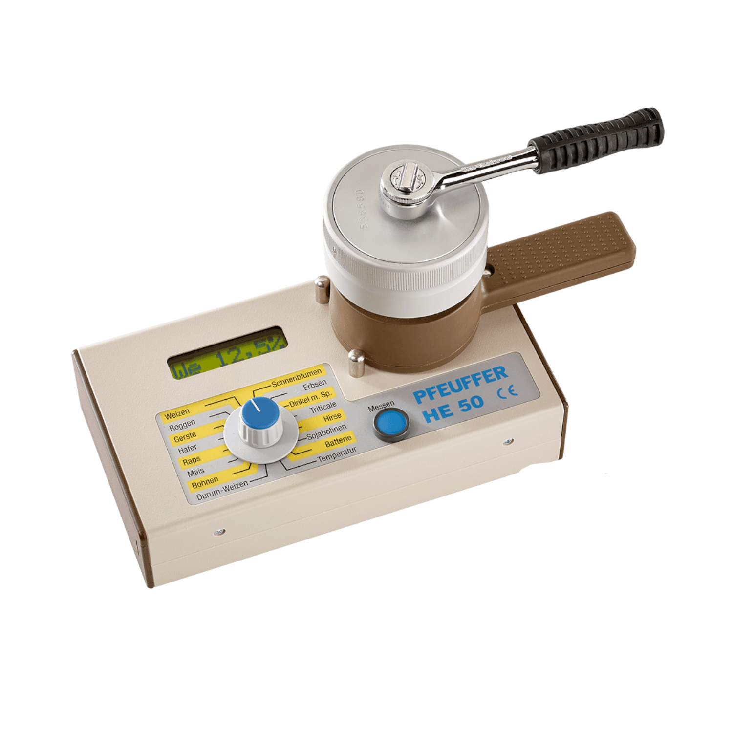- Probe ( 11 ml ) in das Messzellenunterteil und die Messzelle mit Hilfe der Ratsche bis zum Anschlag zusammendrehen. Messzelle auf das Messgerät stecken, Schalter auf das entsprechende Produkt drehen und die Messtaste drücken. Der HE 50 führt die Messung sekundenschnell durch, korrigiert automatisch die Temperatur und zeigt das Messergebnis an. Die speziell für die Landwirtschaft entwickelte Messzelle erlaubt die Messung unterschiedlichster Produkte. Die Homogenisierung der Probe in der Messzelle bildet die besten Voraussetzungen für die exakte Feuchtemessung. Dadurch erreicht der HE50 eine hohe Zuverlässigkeit bei frisch geernteten Getreide bis in den hohen Messbereich. Der HE 50 kann für über 200 verschiedene Produkte kalibriert werden und ist so der vielseitigste Feuchtemesser auf dem Markt. Kalibrationen für Erdnüsse und Glatthafer sind ebenso verfügbar, wie Gräser oder sonstige Körnerfrüchte.