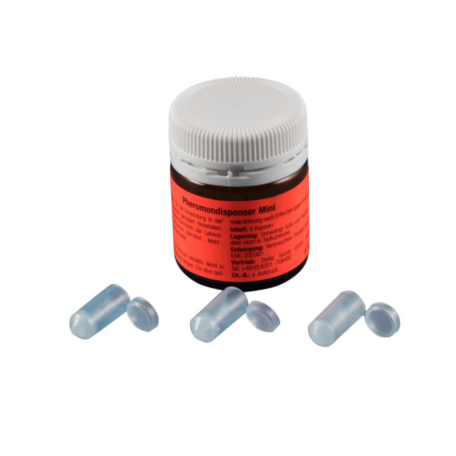 • die Kapseln sind für die Anwendung im Körbchen der Trichtermottenfalle oder für Klebefallen konzipiert. Sie erhalten die Kapseln im Glas zu je 8 Stück.