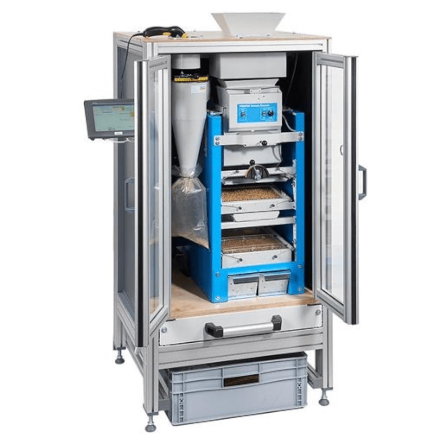 - Der Auto Sample Cleaner verwiegt in einem Ablauf eine Ausgangsprobe Getreide oder Saaten, startet den Probenreiniger SLN 3, führt die Entgrannung durch, öffnet und schließt den Entgrannerboden, führt zeitgesteuert die Reinigung durch und verwiegt automatisch die beiden Fraktionen Kleinkorn und Qualitätsgetreide. Die moderne Bediensoftware zeigt am Display die ermittelten Massen sowie die zugehörigen Prozentanteile an. Bei Bedarf kann das Ergebnis gleich oder zu einen späteren Zeitpunkt ausgedruckt werden. Das Ergebnis besteht aus dem Reinigungsverlust und den Qualitätsgetreide- und Kleinkornanteil. Die gewogenen Proben können in Auffangschalen zur weiteren Analyse entnommen werden oder fallen in eine großen Materialbehälter .Der Panel PC speichert alle Ergebnisse. Er besitzt zwei USB Schnittstellen für Barcode – Scanner ,Tastatur uns USB Datenspeicher. Für die einfache Verarbeitung mit MS Excel können die Ergebnisse auf einen USB – Datenspeicher exportiert werden. Zusätzlich besitzt der Panel PC einen Netzwerkanschluss für eine schnelle, automatische Ergebnisübertragung an einen Warenwirtschaftssystem. Für den Betrieb des Auto Sample Cleaner ist ein Probenreiniger SLN 3 erforderlich. Optional kann ein pneumatisches Transportsystem zur automatischen Probenentsorgung eingesetzt werden.