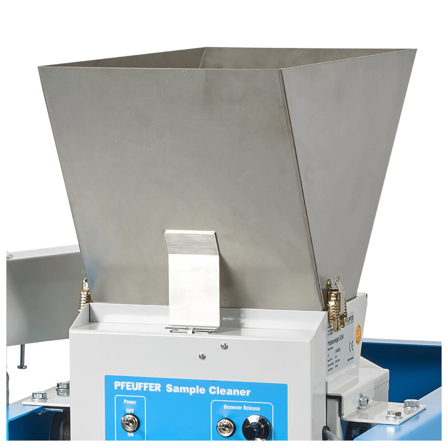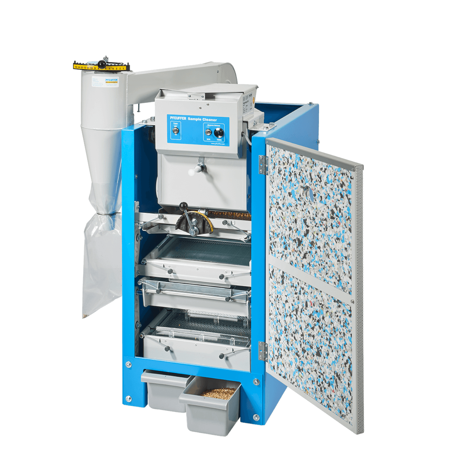 - Probe einfüllen und Reinigungsprozess starten. Während einer vorgewählten Zeit wird die Probe bei Bedarf entgrannt. Danach öffnet sich der Entgranner automatisch und die Probe fällt durch die Aspirationskammer. Der leichte Schmutz wird durch die Aspiration abgesaugt und durch den Zyklon in den Staubbeutel abgeschieden. Die Probe läuft über das Strohsieb, das größere Verunreinigungen aussiebt und danach über das Sandsieb. Durch das Sandsieb fallen Sand und kleine Verunreinigungen. Die Probe wird zuletzt über das Sortiersieb (Modell SLN 4 = 2 Sortiersiebe) geleitet. Gummikugeln verhindern das Zusetzen des Sortiersiebes. Die Verunreinigungen laufen in die seitliche Auffangschale. Das Schmacht – und Kleinkorn wird in der linken Schale und das Qualitätsgetreide in der rechten Schale aufgefangen.